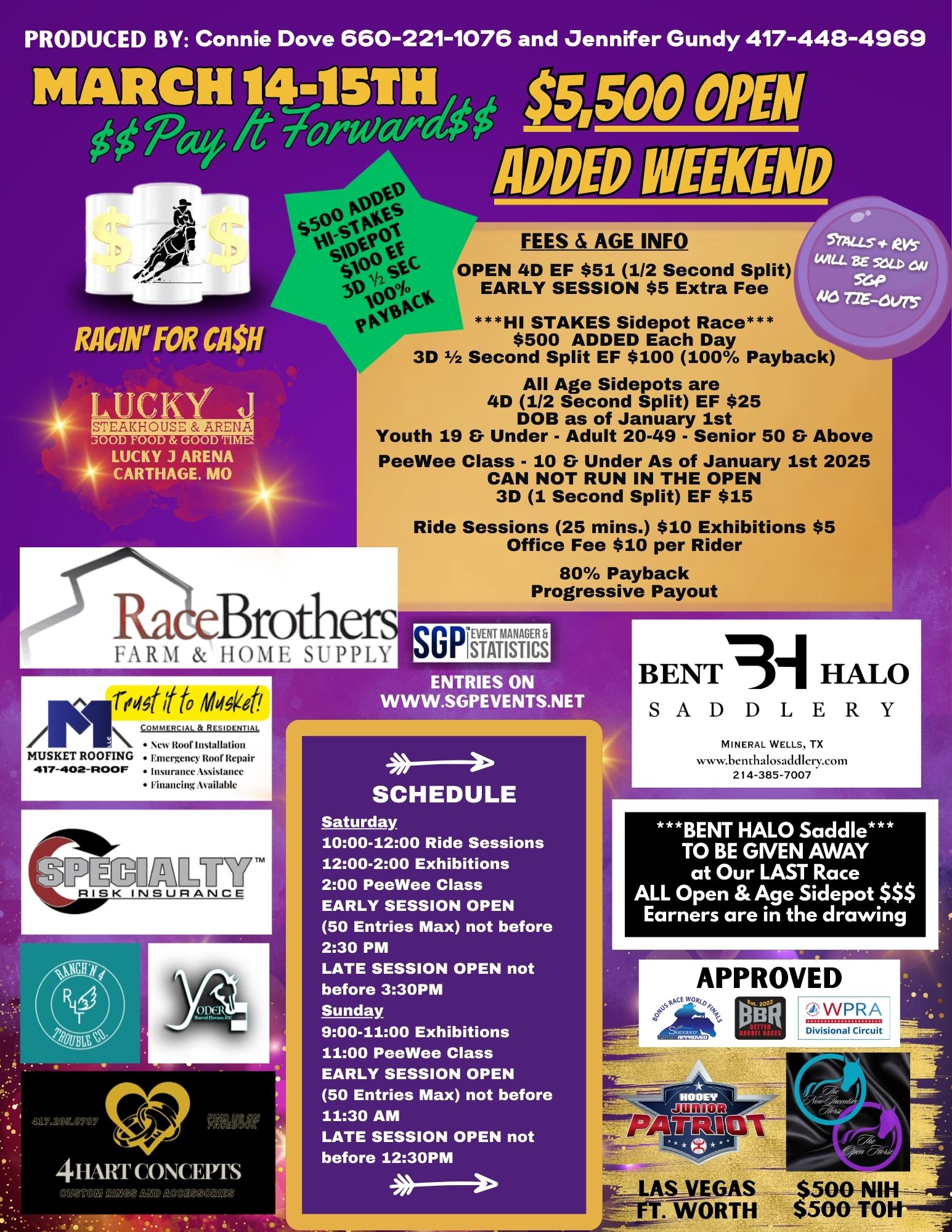 $5,500 OPEN ADDED Racin for Cash + $500 HiStakes - 03/14/2026 to 03/15/2026 - Lucky J Steakhouse & Arena - Carthage, MO
