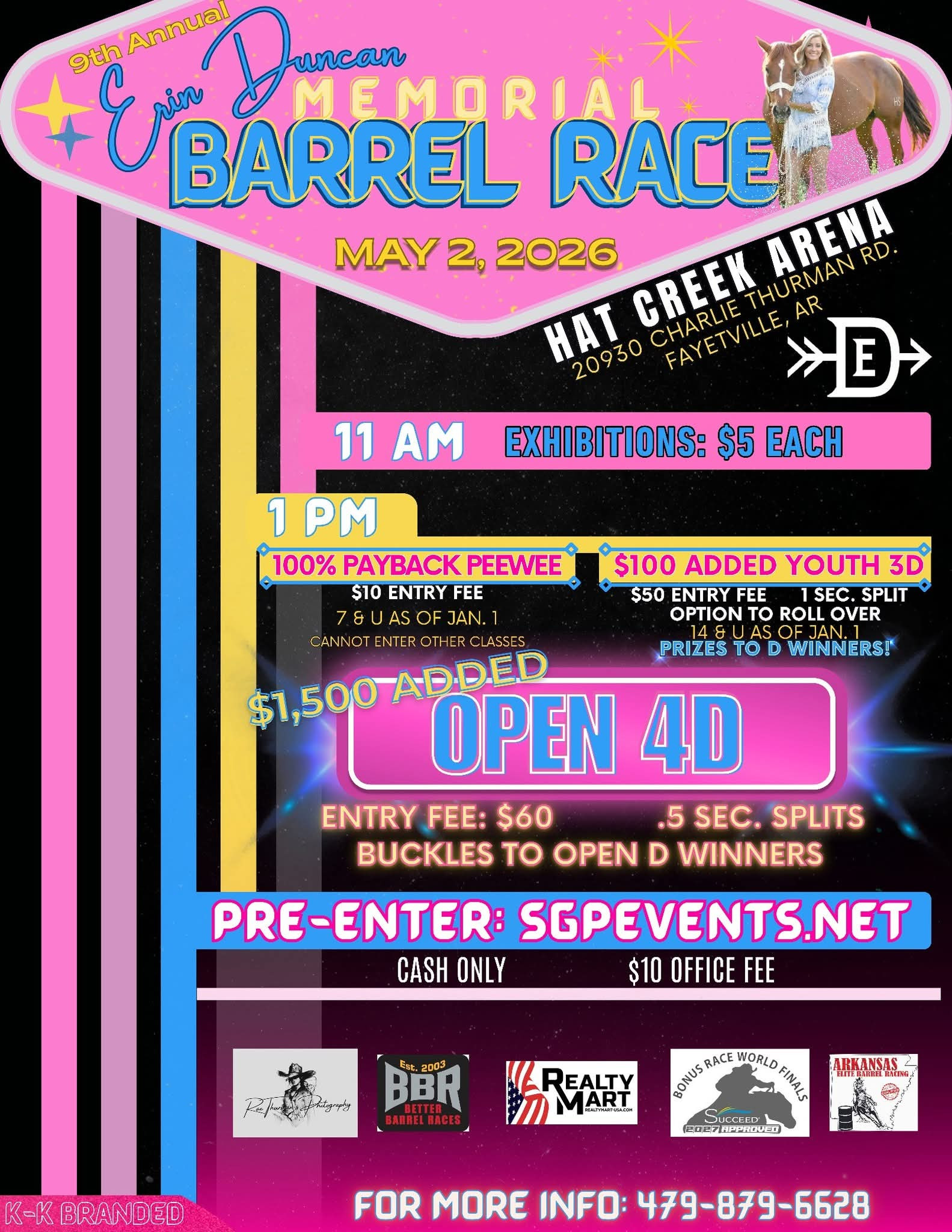 $1500 added 9th Annual Erin Duncan Memorial - 05/02/2026 - Hat Creek Arena - Summer, AR