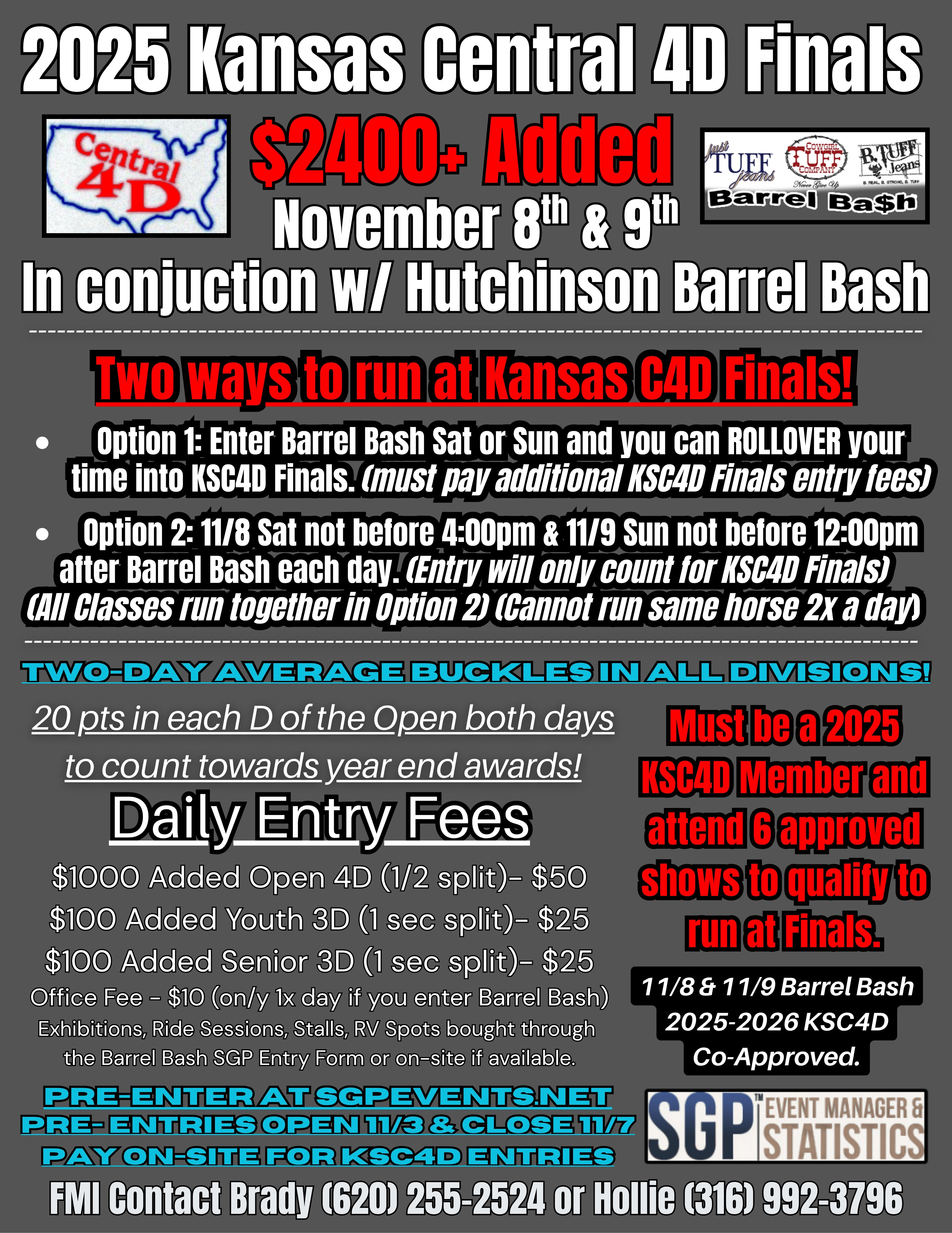 Kansas Central 4D Finals - $2400 Added - 11/09/2025 to 11/10/2025 - State Grounds - Hutchinson, KS