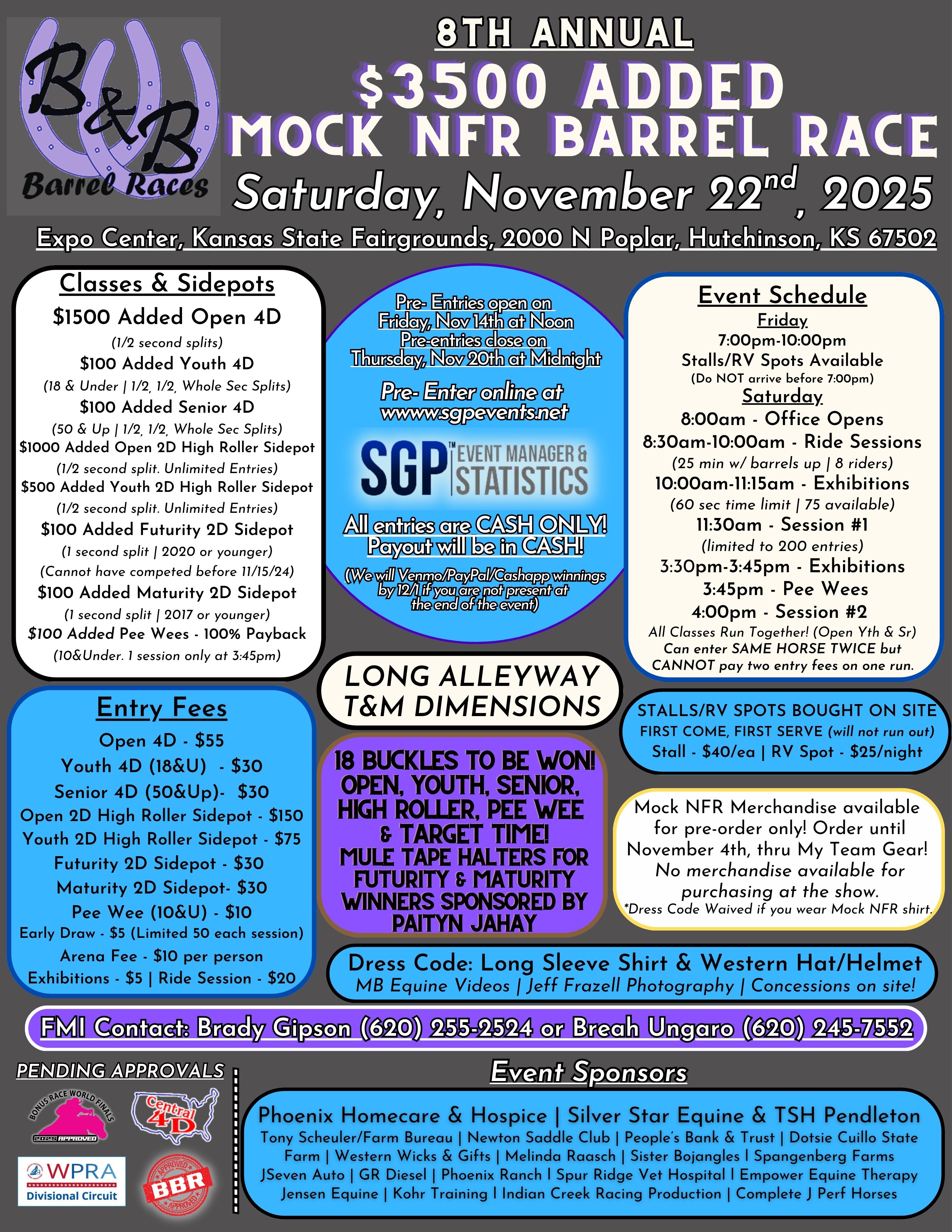 8th Annual $3500 Added B&B Mock NFR Barrel Race - 11/22/2025 - State Grounds - Hutchinson, KS